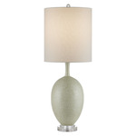 The Verdure Table Lamp has a sophisticated vase-shaped body with a swirling green and white pattern on its surface, which recedes to a lovely stippled effect when seen from far away. The interlocking amoeba shapes only appear when one draws near the green porcelain table lamp. The thin mouth of the body sitting atop an egg shape disappears under an elongated shade. The base and finial are made of optic crystal. 3-way turn knob.