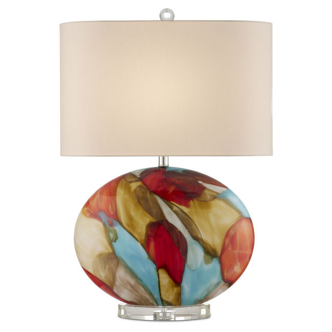 The Vivid Table Lamp lives up to its name with its swirling swaths of bright colors painted on its lozenge-shaped body. The multi-colored lamp glows even before it is fitted with an optic crystal base and finial, and polished nickel hardware. A polished design detail is how the shade is elongated in the same scale as the body and has rounded corners. The narrowness makes the lamp perfect for a spot where a fixture needs to sit close to the wall to free up tabletop space. 3-way turn knob.