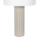The Tambour Table Lamp features a modern scalloped design with a natural concrete base, highlighting its unique texture and shape. The elegant natural brass components complement the body, creating a striking contrast of materials. This blend of industrial and refined elements adds a sophisticated touch to any room, making it a stylish choice for contemporary decor. Three-way cast turn knob is located on the lamp socket.