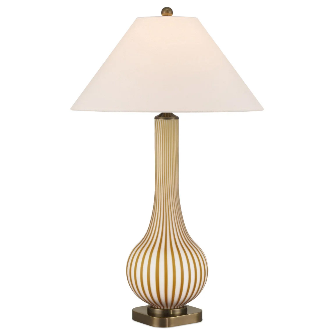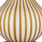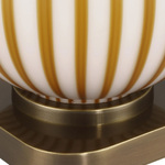 inspired by classic Italian design, the Striae Table Lamp is created using a two-step glassmaking process in which ochre glass rods are fused onto a white milk-glass body to form a stripped pattern. The flared empire shade matches the pale tone, while the antique brass base and finial add a touch of warm. 3-Way switch on socket.