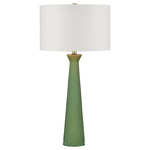 The Grassington Table Lamp features a slender profile with a vibrant pop of green. A column shaped ceramic body is finished with a reactive celadon glaze that is poured on to for an striated effect. As the glaze is added, it flows downward, leaving a lighter color that gradually deepens as it moves toward the base. An oversized linen drum shade brings drama to its profile. 3-Way switch on socket.