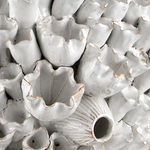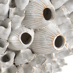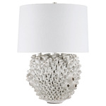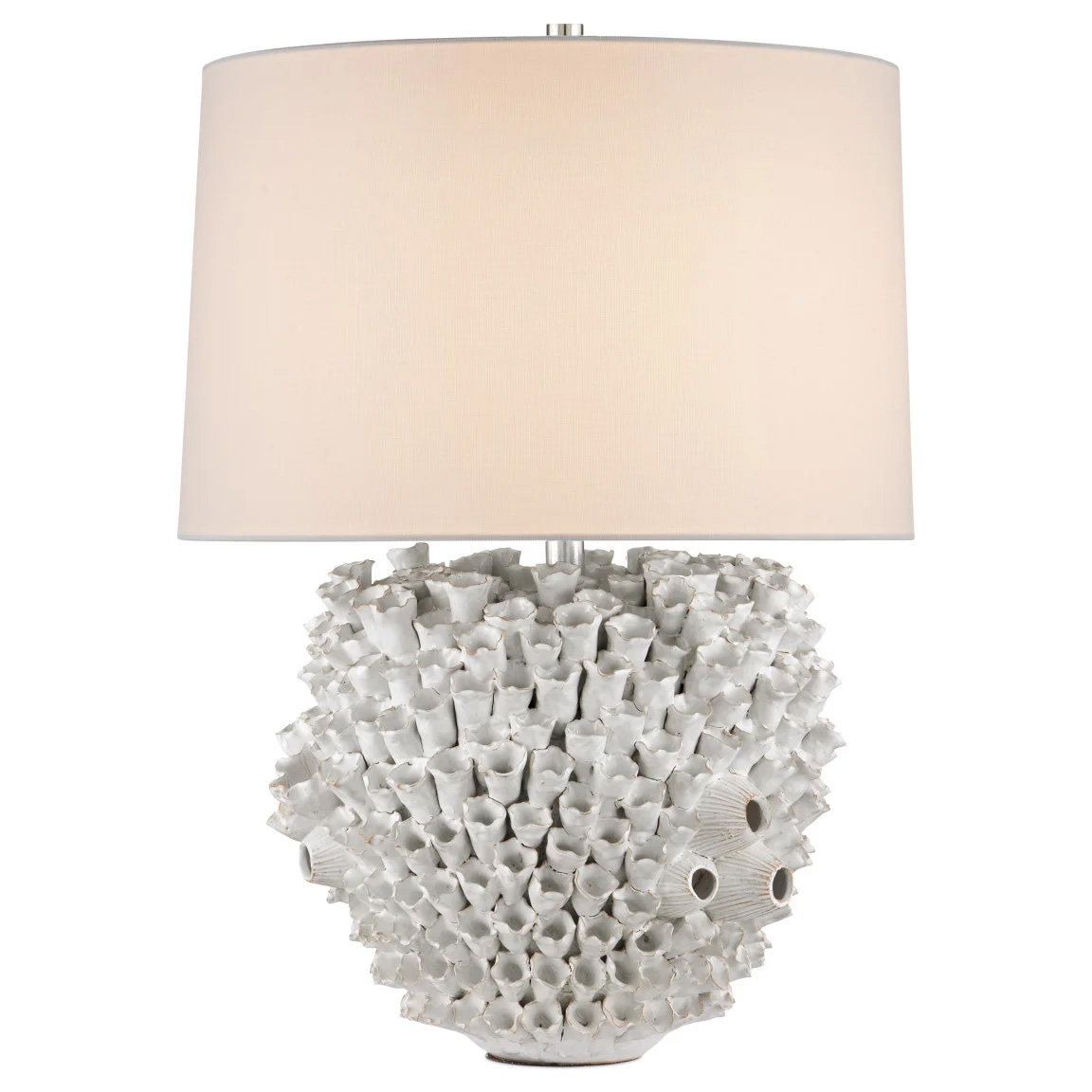 Inspired by Thailand's stunning coral reefs, the Manitapi Table Lamp is a handmade ceramic work of art. Each coral or barnacle-like piece is sculpted and then painstakingly applied to the body to create the unique form. A white linen shade adds a modernizing element. 3-Way switch on socket.
