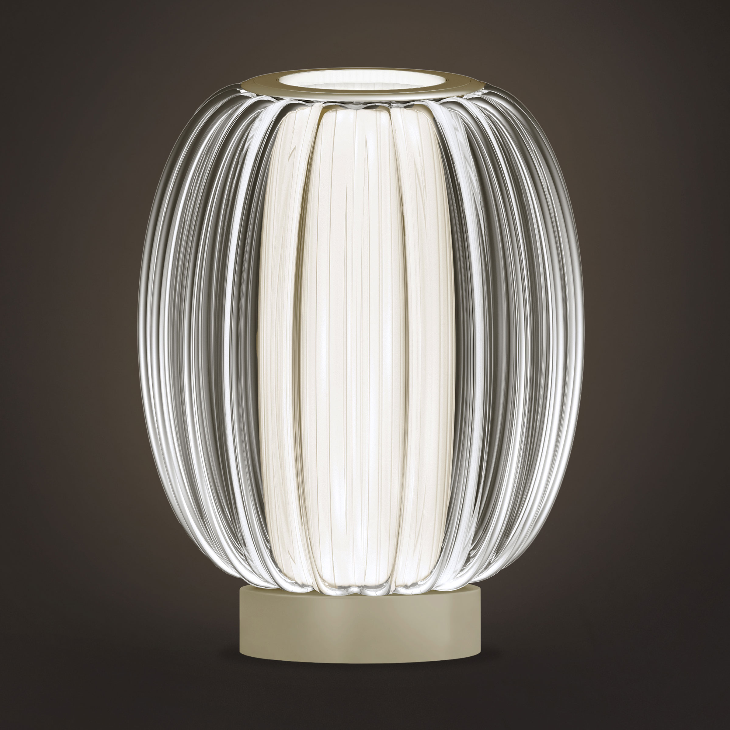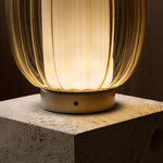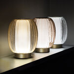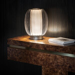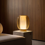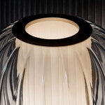 The Alma Lume Table offers a floating, contemporary effect with its combination of textured glass and pleated fabric. The ridged glass diffuser surrounds a cylindrical fabric shade housing the LED light source to provide warm, diffused light. Alma's pairing of classic materials will elevate any interior with a elegance and style. Dimmer switch located on base.