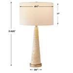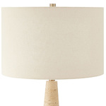 The Perkins Table Lamp combines textured stone and fabric in a bold statement piece. The tapered column body is carved of of honed, unfilled travertine with rich patterning. For a contrasting softness, the drum hardback shade is covered in a light beige linen fabric with natural slubbing. 3-Way switch on the socket.