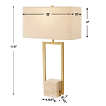 With an open framed body, the Warrick Table Lamp balances a dramatic form with an airy aesthetic. Grounded with a travertine block base, the angular brass plated frame rises up to meet the rectangular hardback shade. Finished in linen light slubbing, the shade provides a soft textural contrast. 3-Way switch on socket.