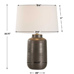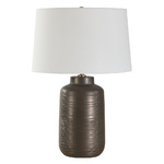 The Calderone Table Lamp blends casual charm with modern style. The warm, dark bronze porcelain base has distinctive horizontal ridges, and is accented with brass plated detailing for a classic touch. The white linen hardback shade provides soft, even illumination. 3-Way switch on socket.