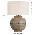 Inspired by ancient pottery shards, the Rock of Ages Table Lamp features a weathered, timeless finish. The textured ceramic base is glazed in earthy tones of soft gray with a light rust wash. Dark bronze accent detailing complements the glaze tones. The drum hardback shade is covered in a white linen. 3-Way switch on socket.