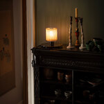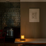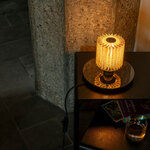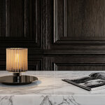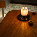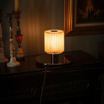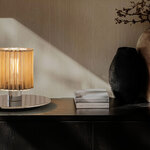 When viewed from above, the In The Sun Table Lamp recalls the shape of the sun with its pleated cylindrical shade made of metal mesh. The shade houses the lamp's bulb, which casts a dazzling display of light and shadow onto its surroundings. In the Sun's simple, petite design will complement a variety of decor styles from classic to contemporary. Dimmer switch located on cord.