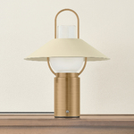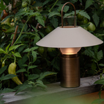 Designed for life in motion, Kindle Rechargeable Table Lamp is a versatile rechargeable lamp with a vintage-inspired silhouette. A Soft Sand shade, etched clear glass, and Patina Brass details lend a warm, artisanal presence, while the carry handle adds function and charm. At 14.5 inch high, it's perfectly sized to move effortlessly from room to gardenbringing light wherever it's needed most. Touch dimmer located on fixture. Black fabric usb-c charging cord included. Battery life is 12-15 Hours long.