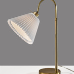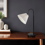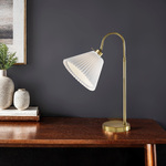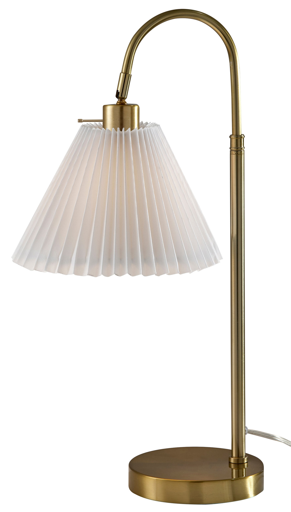 The Thalia Table Lamp is a sleek and sophisticated addition to any room in your home. With a gracefully curved pole, this lamp combines modern elegance with timeless style. Its 25 inch height and white knife pleated tapered shade provide a soft, inviting glow, perfect for creating a cozy ambiance. On/Off rotary switch is located on the lamp socket.