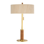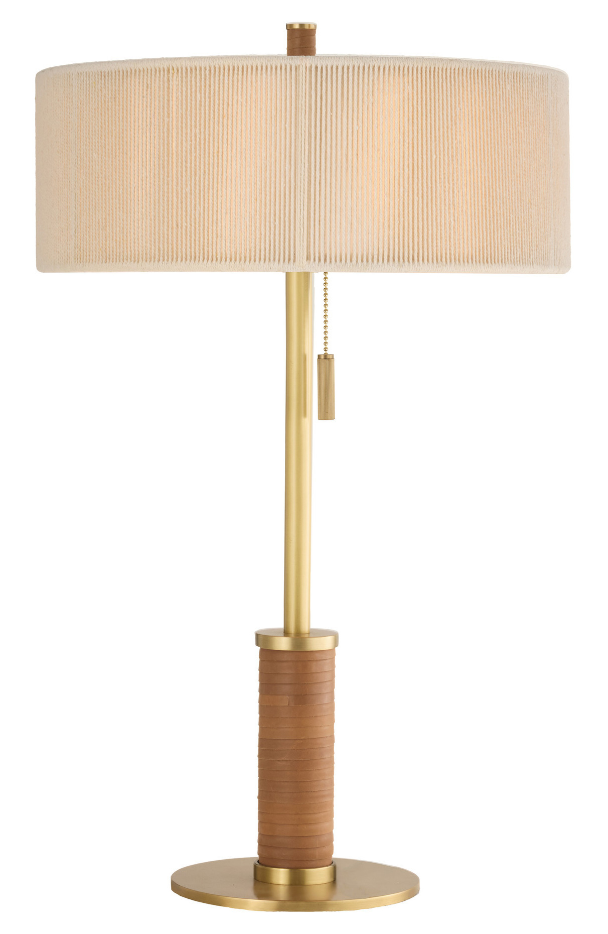 The Middlebury Table Lamp brings a sleek midcentury modern look to your interior space. The slim stem, wrapped in Brown Leather is topped by a drum shaped cotton string shade with a White lining that casts warm shadows across your room. On/Off pull chain is located on the lamp socket.