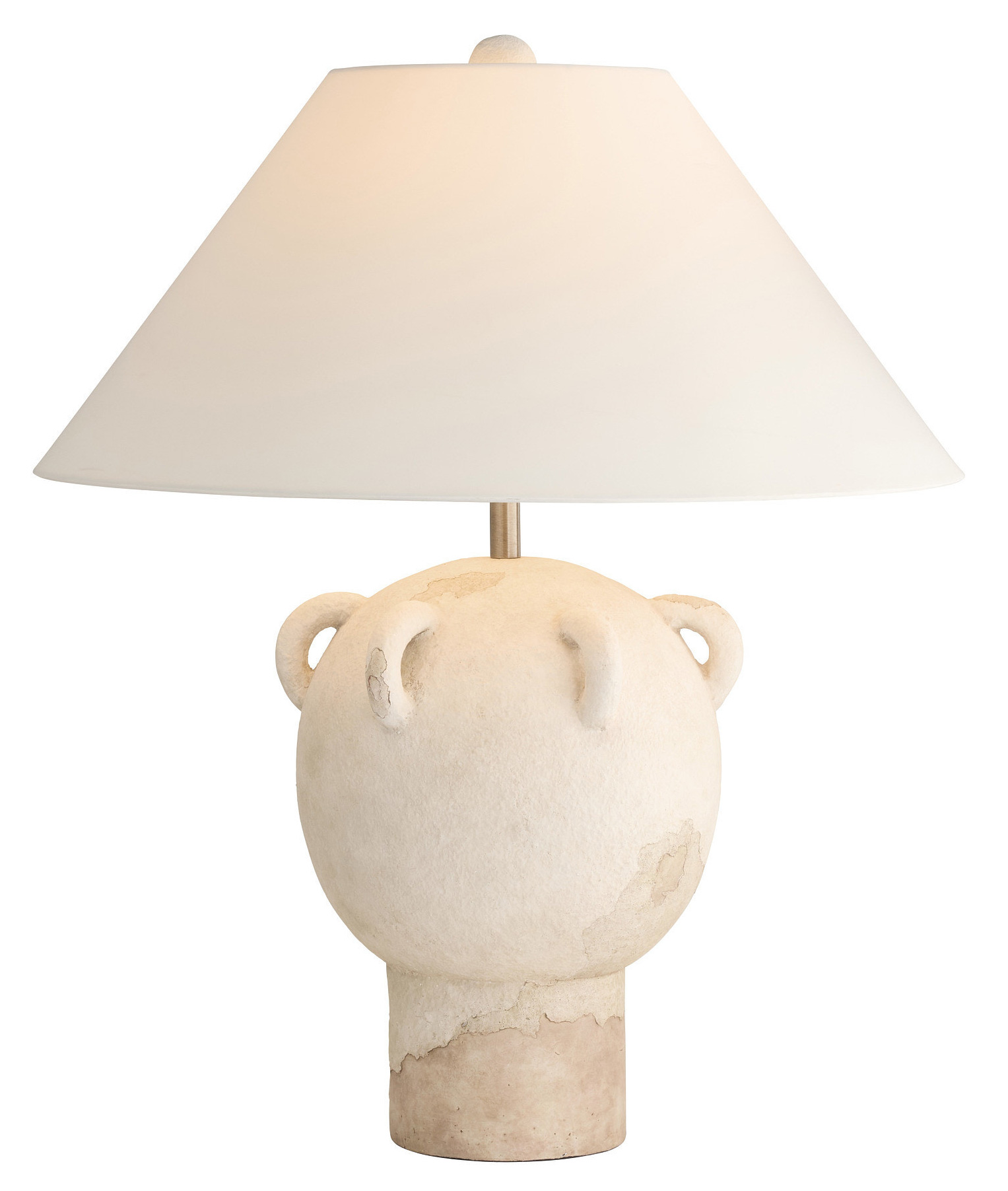 The Neela Table Lamp is inspired by an antique olive vessel from the Mediterranean. The classical shape and the Tuscan washed finish, is complemented with with dark antique brass-plated steel hardware and a tapered microfiber shade. On/Off rotary switch is located on the lamp socket.