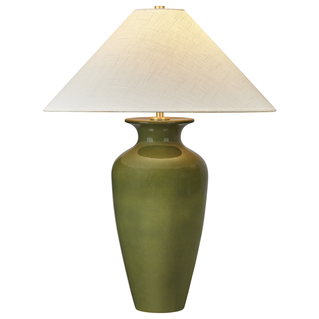 Creating a vivid color moment is the ultimate goal of the Grassy Point Table Lamp. This statuesque ceramic lamp is finished in a glossy Norrie Green glaze that champions an unexpectedly fresh hue. Designed as a companion piece to French Ridge, this larger-scale lamp is completed with a classic textured linen shade and Aged Brass hardware. Full range dimmer located on socket.
