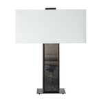 The Horizon Table Lamp brings a distinctive elegance to your interior space. Its body is crafted by master artisans, revealing plates of forged steel and a clear coating that highlights its unique character. A rectangular fabric shade completes the design, casting warm, inviting light throughout the room. Dimmer switch is located on the body.