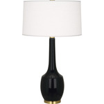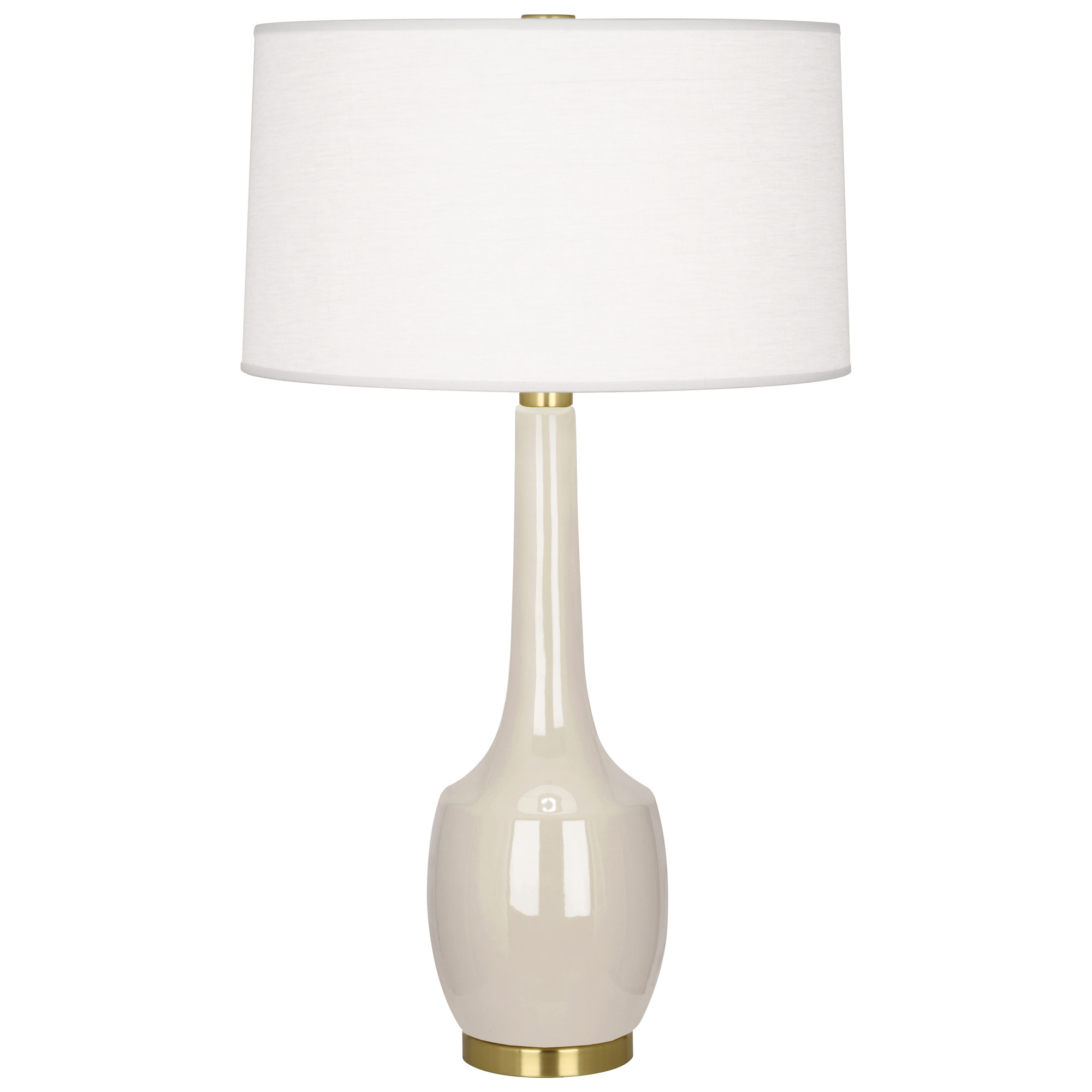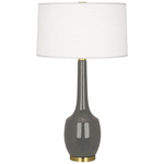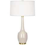 The Delilah Table Lamp adds a clean elegance to your interior space. The urn-shaped ceramic body rests on an Antique Brass base and is topped with a hardback linen shade, with a top and bottom diffuser, that casts warm light across your room. Full range dimmer switch is located on the lamp socket.