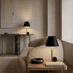 The geometric-inspired Calee XS Table Lamp features a slim stem resting against a cylindrical base. Choice of Satin Brass, Satin Copper, Satin Graphite, or Satin Nickel with a Black or White Chinette flared shade. Choose a color for the stem and a finish for the cylindrical base. Shown with Satin Nickel color and Satin Graphite finish.