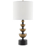 The Chastain Table Lamp offers a chic, sculptural look featuring a Black base and stem with Antique Brass finished basin like half circles stacked along the body, topped with a tall Off White drum shade. 3-way rotary switch located at socket. UL and cUL listed.