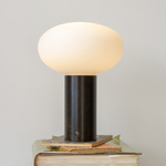 The Mushroom Table Lamp brings a playful vibe into a variety of spaces. The Frosted glass diffuser sits atop a machined steel cylindrical base. Includes touch dimmer on base.