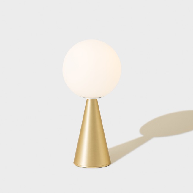 The Bilia Mini Table Lamp brings a geometric feel to your space with its cone and globe shapes. The perfect little brother to the classic Bilia Table Lamp. The Frosted White Glass globe sits atop a cone that is finished in Brass, Black, Blue, Gloss Black, Copper, Green, Brushed Nickel, Red, Yellow, or White. Transparent cable with On/Off switch and plug.