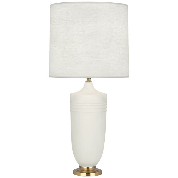 The Michael Berman Hadrian Table Lamp features a glazed ceramic base with metal accent and an Oyster linen shade. Its elegant silhouette will fit seamlessly into a living room or vedroom. Full range dimmer switch on socket.