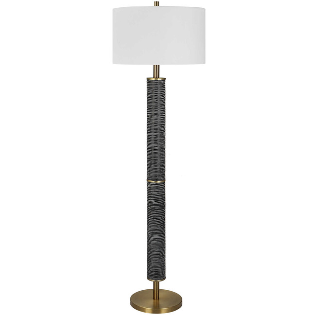 The Summit Floor Lamp features an organically carved design in a rustic gray-black with solid iron details finished in plated antique brass. The lamp is paired with a hardback drum shade in a white linen fabric. 3-way switch on socket.