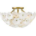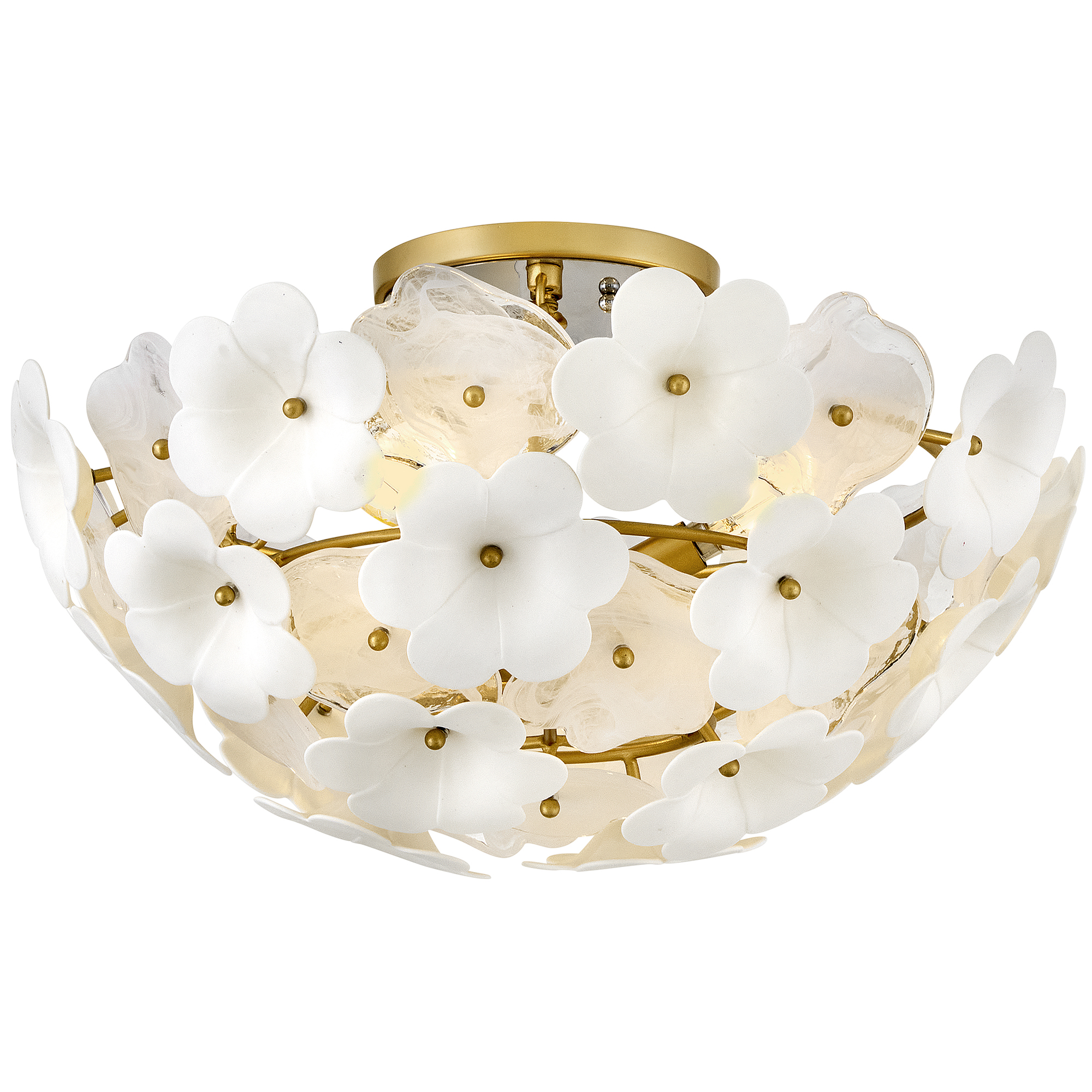 Decadently arranged in glamorous clusters, the Marianne Semi Flush Ceiling Light's wispy-patterned white glass and ceramic blossoms create an elegant organic silhouette enhanced by a luxurious glow. Intricate frames in our Deluxe Gold finish capture warm inviting illumination.
