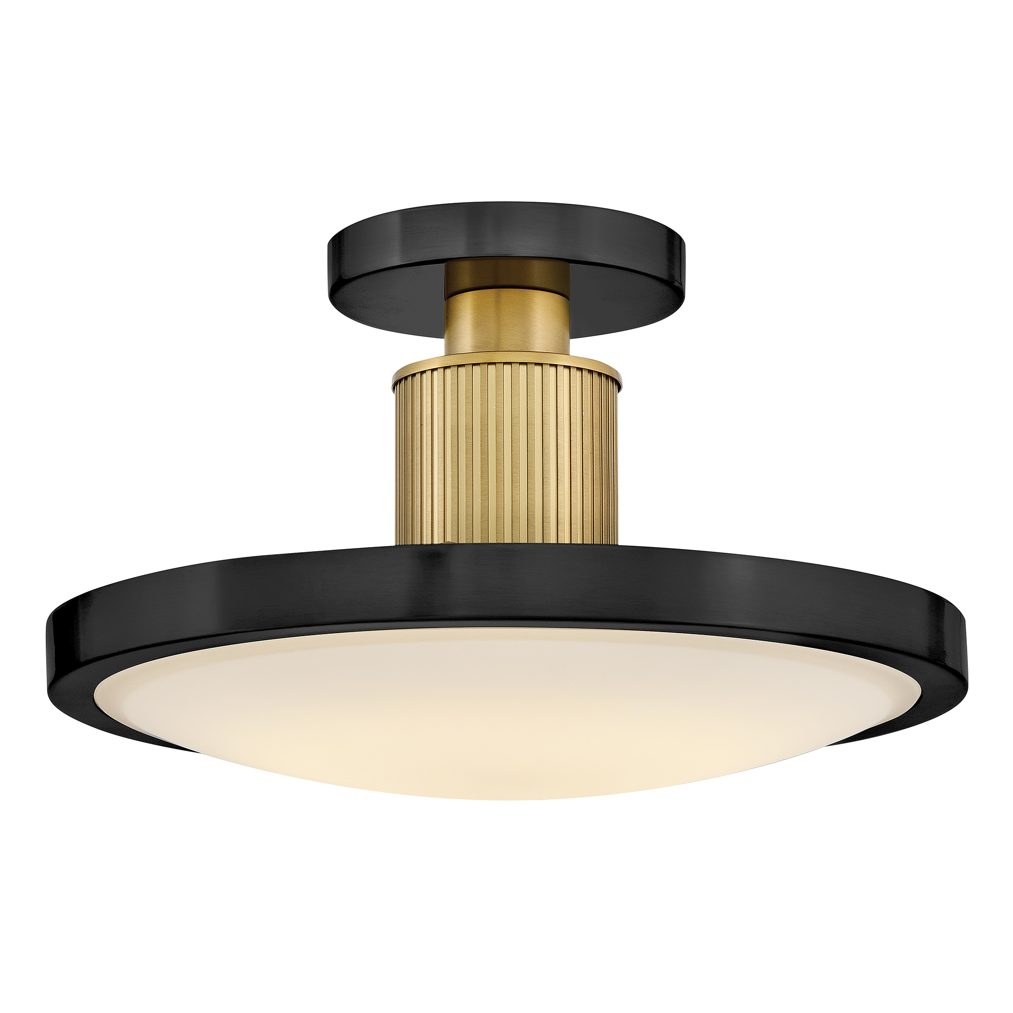 With a midcentury-inspired low profile, the Kieran Semi Flush Ceiling Light's stylishly slim silhouette accentuates its large Etched White glass shade with a thin frame and ribbed central column. Integrated dimmable LEDs provide bright yet comfortable illumination.