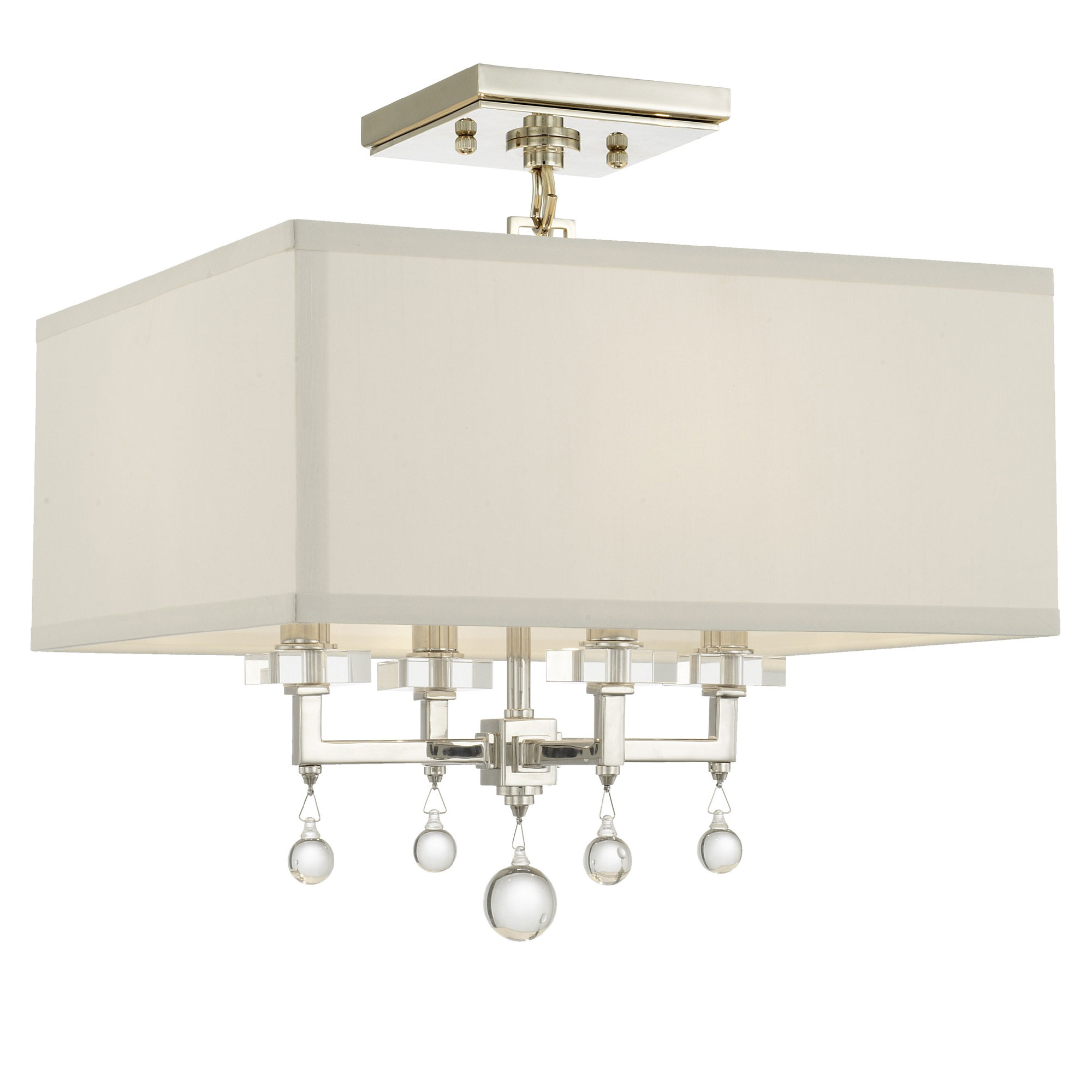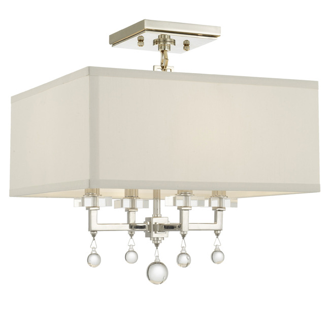 The Paxton Semi Flush Ceiling Light has a retro yet modern style that provides sophisticated beauty to any space. A Polished Nickel or Antique Gold base supporting a Crystal pedestal is topped with a crisp White Linen shade, finished with an added element of a smooth Crystal ball, the design is simple and refined. UL listed.