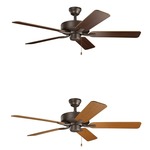 The Basics Pro Ceiling Fan offers a classic design that complements a variety of dcor and styles. Available in Matte White with reversible Matte White/Silver blades, Satin Black with reversible Satin Black/Silver blades, White with reversible White/Silver blades, Brushed Nickel with reversible Silver/Walnut blades, or Satin Natural Bronze with reversible Cherry/Walnut blades. Features a 153mm x 15mm AC motor, five reversible wood blades with a 52 inch blade sweep, and a 12 degree blade pitch. Includes a 3-speed pull chain (3 forward and reverse/manual reverse), and a 4 inch downrod. UL listed. Limited lifetime warranty. Optional light kit and limited function wall or handheld control system, or universal handheld control system sold separately.