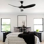 Maverick II Ceiling Fan with Light features a sleek and modern silhouette with three softly rounded blades and delivers incredible airflow, making this perfect in any room of your home. Features 85x28mm premium power, ultra-efficient, energy-saving 6 speed reversible DC motor, 13 degree pitch, and 52, 60, or 70 inch blade span. Available in Brushed Steel with Walnut or Koa blades, Matte Black with Dark Walnut blades, Aged Pewter with Koa blades, Matte White with Matt White blades, or Black with Black blades. Includes one 6 inch downrod and hand-held 6 speed remote with reverse and dimmer function. May be mounted on a slope ceiling.