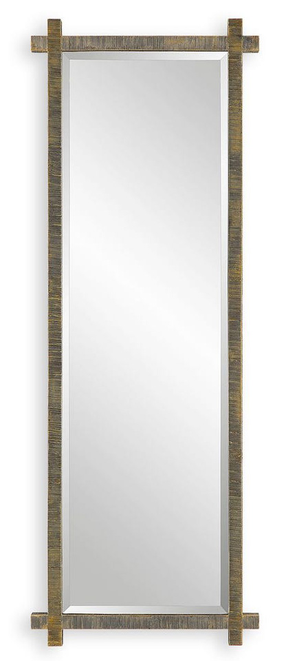 The Abanu Tall Mirror features an antique gold finished frame with ribbed texture, adding a tribal feel. The piece has a generous 1 1/4 inch bevel and may be hung horizontal or vertical.