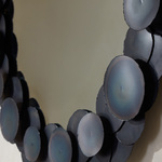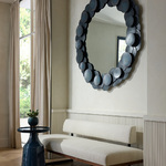 The Kensey Discs Mirror offers a chic look that will accent a number of interiors, featuring a round plain glass mirror framed in an array of large iron discs finished in an oxidized Burnt Iron for a slightly iridescent appearance.