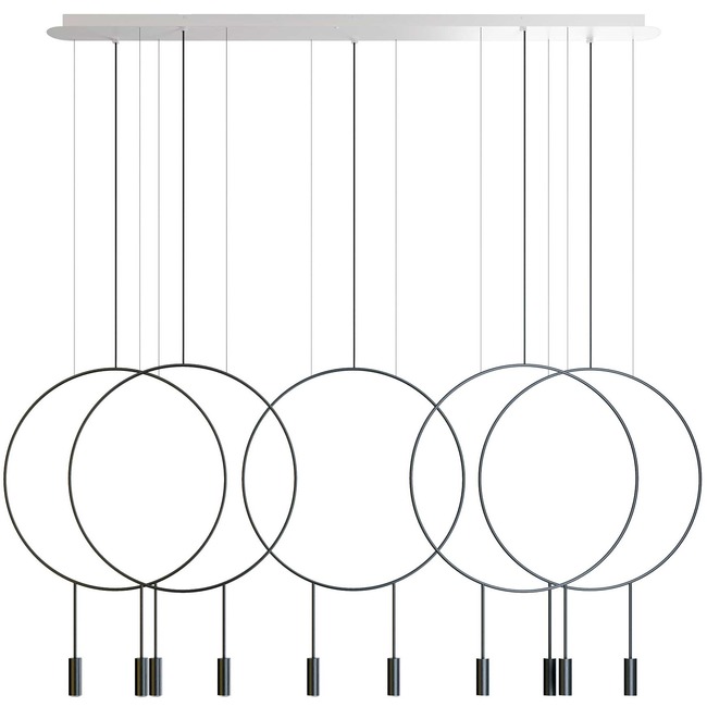 The Revolta L165S.5D Linear Multi-Light Pendant offers an airy, modern look featuring five open circles that appear to have been sketched in the air paired with cylindrical pendants below with Aluminum heads and acrylic diffusers. Optional acoustic panels offer a unique solution to soften room noise and serve as room dividers in large spaces. Available with Black or Satin Gold heads with a Black or White canopy. Acoustic panels available in Blue, Black, Eggplant, or Salmon; sold separately. Accommodates 23.6 inch diameter panels.