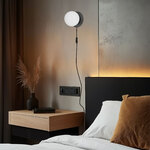 The Burlat Plug-In Sconce displays a modern sensibility and contemporary style. An opal white glass bulb is contrasted by metal base, creating a streamlined look for the bathroom, foyer, or office. Includes on/off rocker switch on cord.