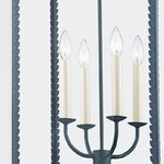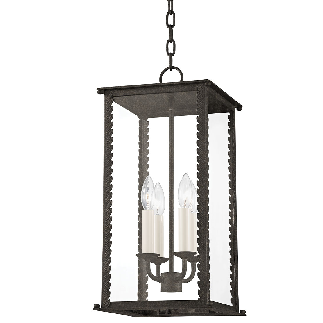 The Zuma Outdoor Pendant features a candelabra style cage with a delicate leaf detail climbing up the edges, revealing demure finials on each corner. Clear glass allows you to admire the candlestick lights clearly.