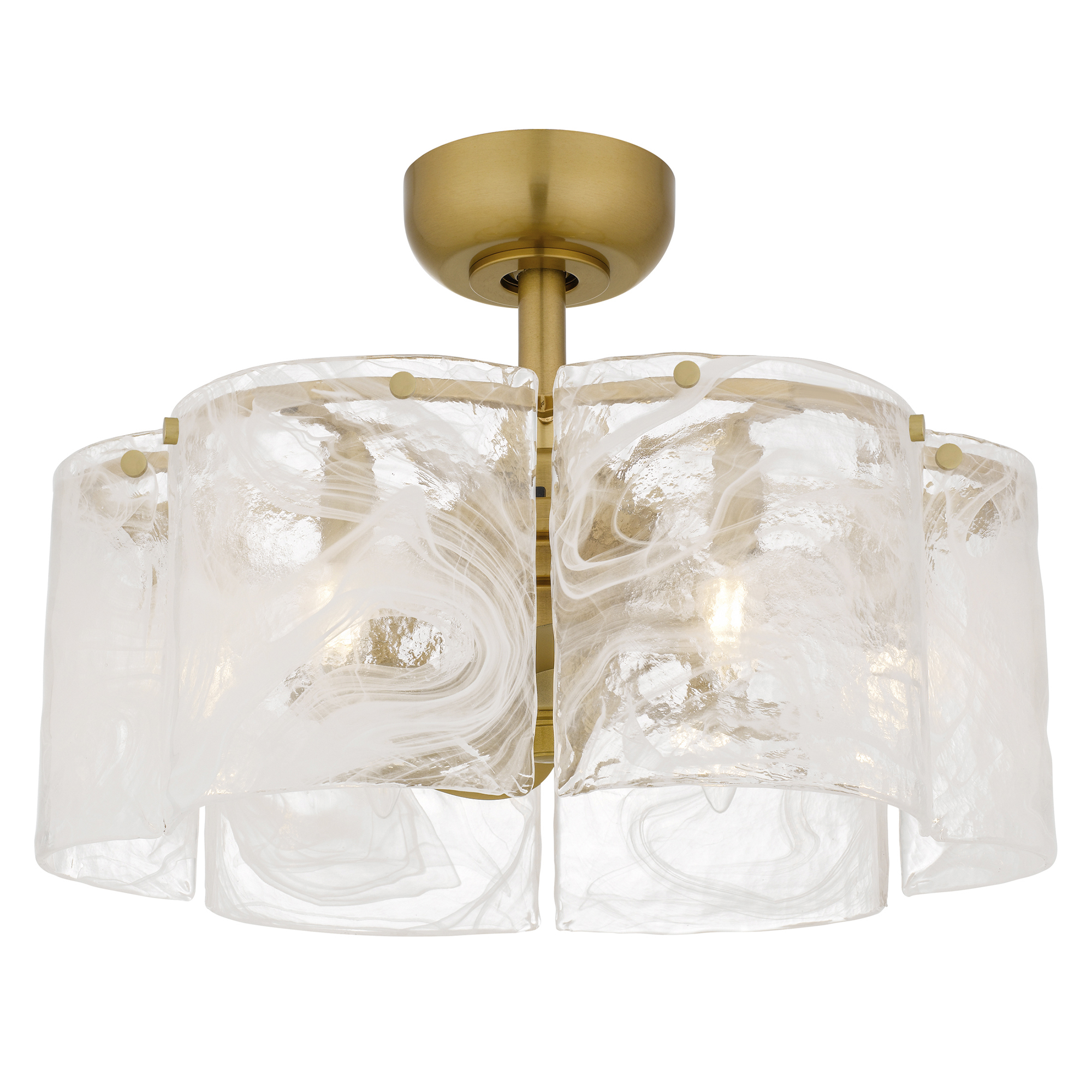 The Maisie Fandelier captures the soft poetry of air and light in motion. Gently curved panels of white swirl glass surround the fixture like flowing silk, their delicate patterns evoking wisps of clouds on a golden afternoon. Each glass piece is uniquely marbled, creating a luminous effect that shifts with every glance. Anchored in a warm brushed gold frame, Maisie feels both airy and grounded - an elegant fusion of modern form and timeless romance. Downrod and Remote Control included.