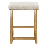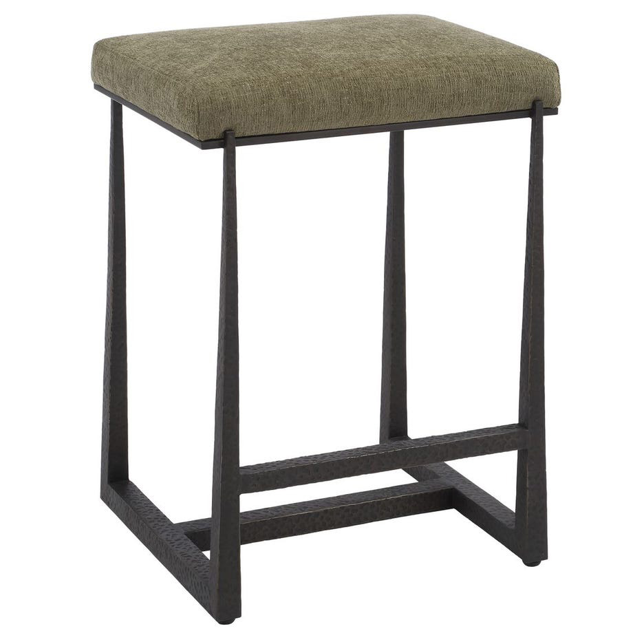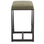Combining comfort and elegance, the Midas Counter Stool adds a touch of luxury to any room. The textured legs are finished in either bronze or gold and are antiqued for a vintage look. The seat is upholstered in a durable polyester fabric that comes in a finely textured moss green tone or a wool-like white driftwood color.