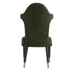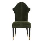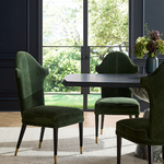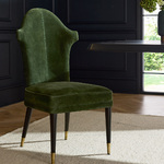 The Lincoln Dining Chair brings a whimsical look to your space. The traditional demi wing chair has beech wood legs in an ebony finish and flared back detail. Topstitched couturier accents allow this chair to appear equally stylish from the back, making this suitable at a dining table in multiples or singly in front of a vanity. Antique brass ferrule details complete the tailored look.