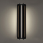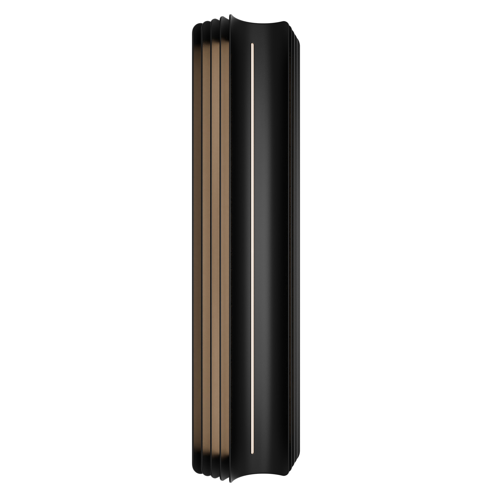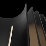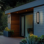 The unique Kane Outdoor Wall Light features an intriguing silhouette crafted from curved layers. When illuminated, light spills past each metal sheet, providing a soft, ambient glow. A strip of light light down the center adds the finishing visual touch.
