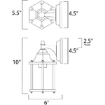 Builder 1026 Outdoor Wall Light features Clear glass panels with a Black, Empire Bronze, or Rust Patina finish. One 60 watt, 120 volt A19 Medium base incandescent bulb is required, but not included. Wet location rated. 5.5 inch width x 10 inch height x 6 inch depth.