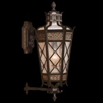 The Chateau Outdoor Top Mount Wall Light features a rich Umber finish with Gold accents and Antique glass. Four sizes available. Extra Small: One 60 watt max 120 volt B10 candelabra base bulb is required, but not included. 9 inch width x 15 inch height x 9 inch depth. Small: One 60 watt max 120 volt A19 medium base bulb is required, but not included. 11 inch width x 25 inch height x 13 inch depth. Medium: Four 60 watt max 120 volt B10 candelabra base bulbs are required, but not included. 14 inch width x 32 inch height x 16 inch depth. Large: Four 60 watt max 120 volt B10 candelabra base bulbs are required, but not included. 16 inch width x 37 inch height x 19 inch depth. UL listed for wet locations. Made in the USA.