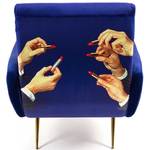The Lipsticks Armchair offers a quirky, humorous look playing off mid-century modern inspired design and upholstered with an unexpected, surreal image of hands holding lipsticks on a rich blue backdrop with Polished Brass legs.