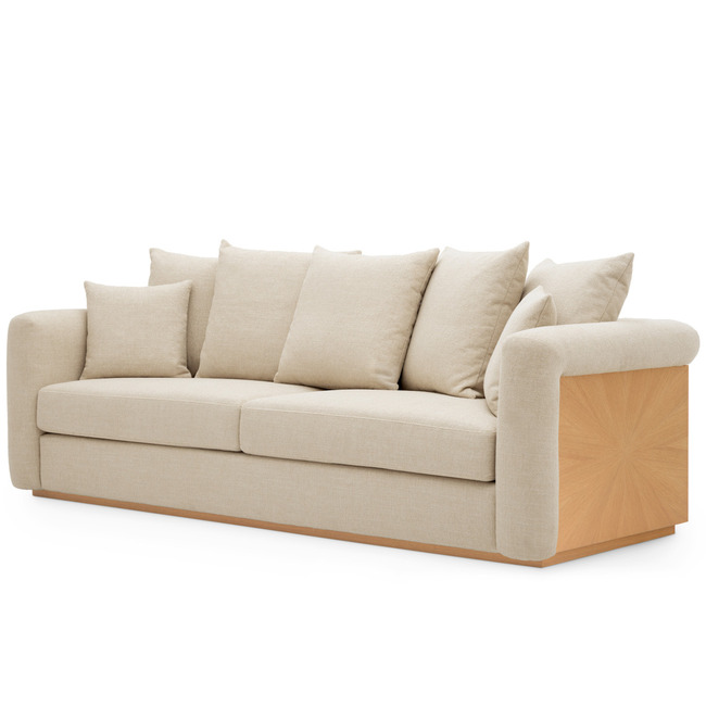 With a refined, oversized silhouette, the Amadeo Sofa blends warm wood tones with a soft, sophisticated fabric. Natural oak veneer paneling forms radiating starbursts on three sides, with cushions of Renato Ecru upholstery made of 49% recycled polyester. This sofa is perfect for creating an inviting seating area in a living room, den, or anywhere you need a touch of timeless elegance.