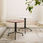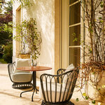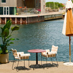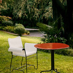 The Carmel Bistro Table uses the durability and unique character of single-fired stoneware to create a versatile and stylish outdoor table. The square tabletop with rounded edges is finished in a glossy glaze and features gentle curves for a playful expression. A streamlined, matte black metal base anchors the table and creates a striking color contrast. Suitable for indoor or outdoor use.