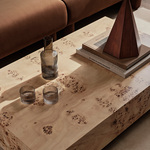 The Burl Coffee Table possesses a simple silhouette that showcases the beautiful natural texture. Each unique piece features is crafted with a poplar burl veneer, with swirling wood patterns. Perfect for a living room or den.