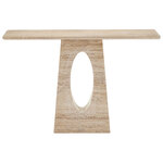 The Demi Console Table is made of solid stone. A bevel softens the oval that is carved into the stone on both sides to infuse the accent table with sophistication, as the cut-outs form an oculus. The way the base tapers to a smaller form toward the top is a shapely design move, as is the chamfered detail under the top. This table has a dynamic personality thanks to the veining in the stone, which means each one will be unique.