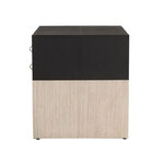 The Joplin Side Table is a modern mix of materials that elevates this sophisticated piece. The smoke oak wood waterfall case is juxtaposed with luxe black embossed leather on the top and front, with stitched details to highlight the black shagreen. Punctuated by antique brass inlay and delicate pulls, this handsome piece features two soft-close drawers and an open shelf for essentials.