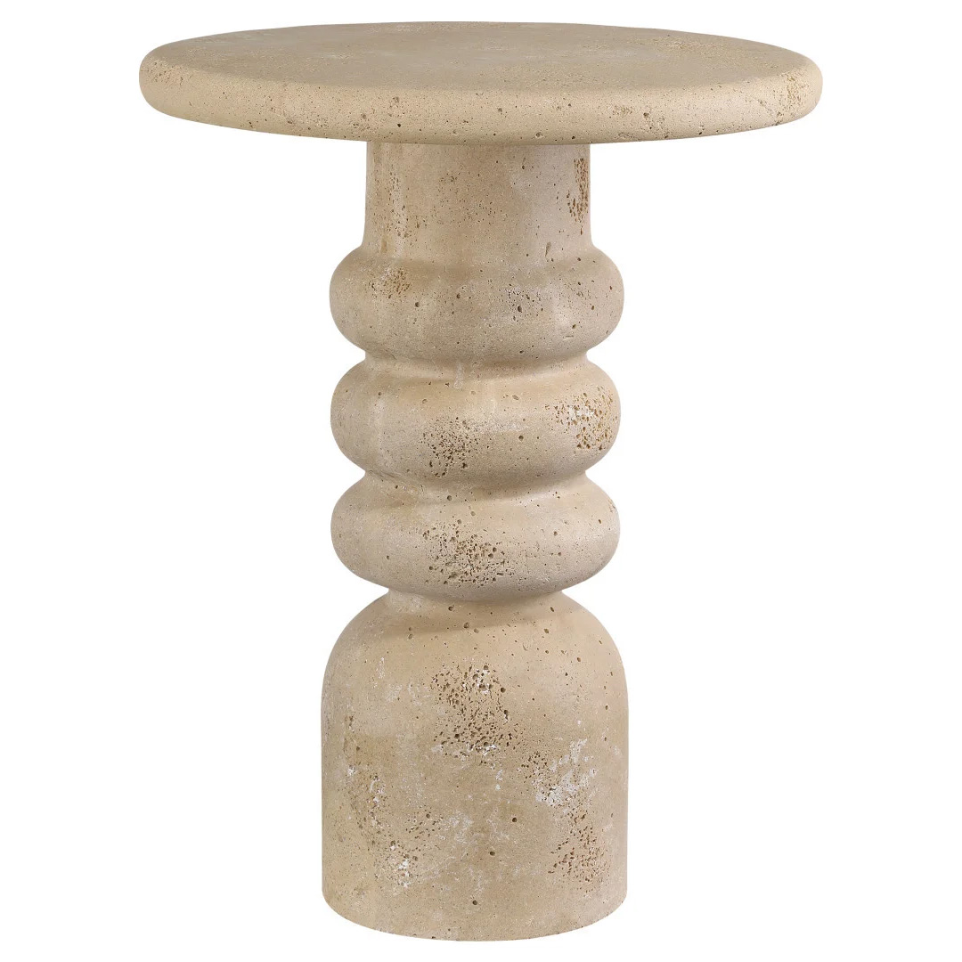 The Rocco Accent Table is formed from stone powder and composite, expertly mimicking the unpolished, natural beauty of of marble. This beige table has a softly rounded pedestal fit for a variety of styles, from contemporary to traditional.