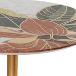 The Roselle Accent Table features an exquisite floral inlay top in a lively mix of marble shades. White Carrara marble forms the background to a pink and green marble flower, outlined in brass. A slender stem in a brass finish is set in a green marble base, which is hand-chiseled to create a striking ridged texture.