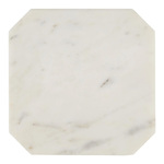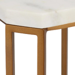 The Ocho Drinks Table is a slender piece that showcases luxurious Banswara white marble. The stunning marble square top is supported by an tall iron frame finished in an antique brass, which rises gracefully from a geometric cross-shaped base at the floor.
